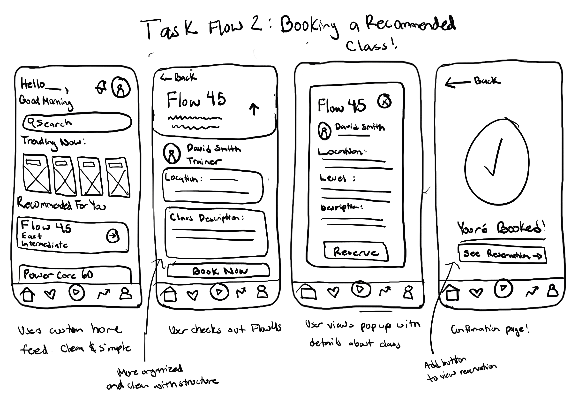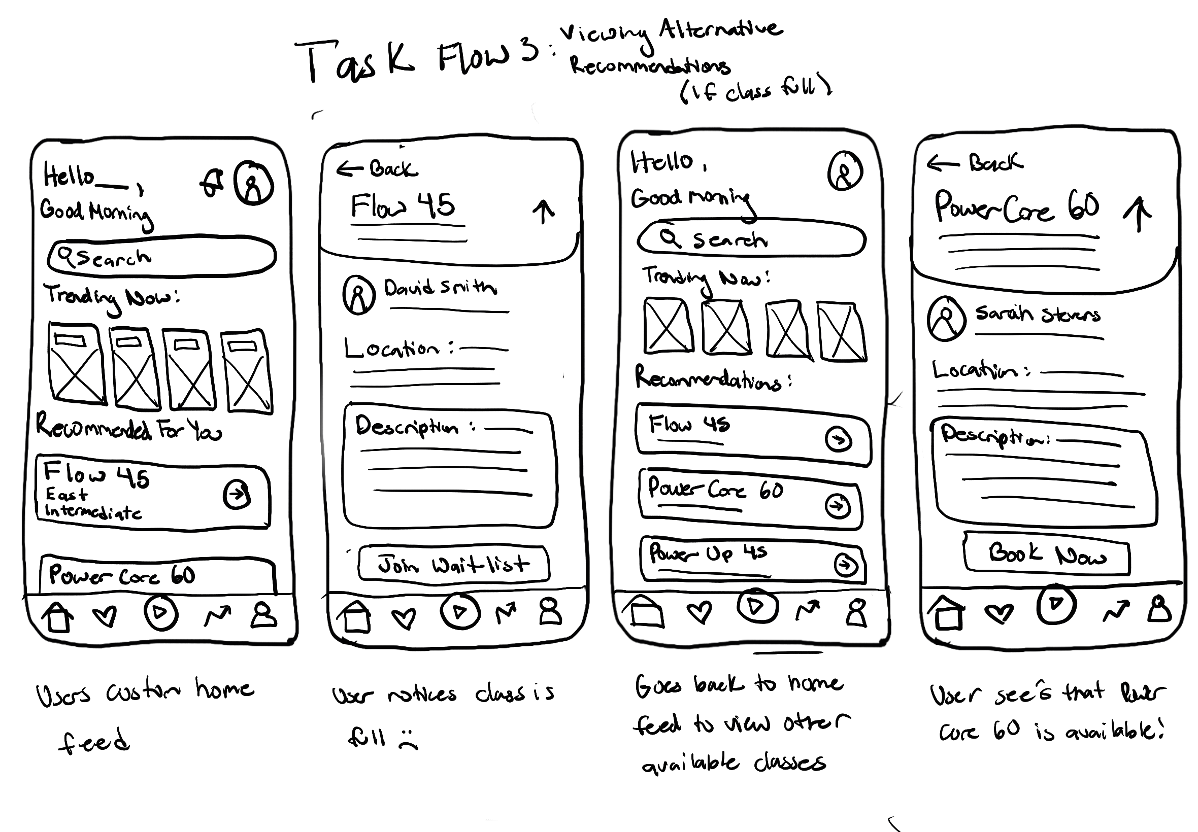 I kept my sketches low-fidelity and focused on getting ideas down quickly without worrying about details. This helped me stay flexible and think through the overall structure of each flow. For example, in the “class full” flow, I made sure the user wasn’t left at a dead end by including recommended alternative classes, allowing them to continue booking without frustration.