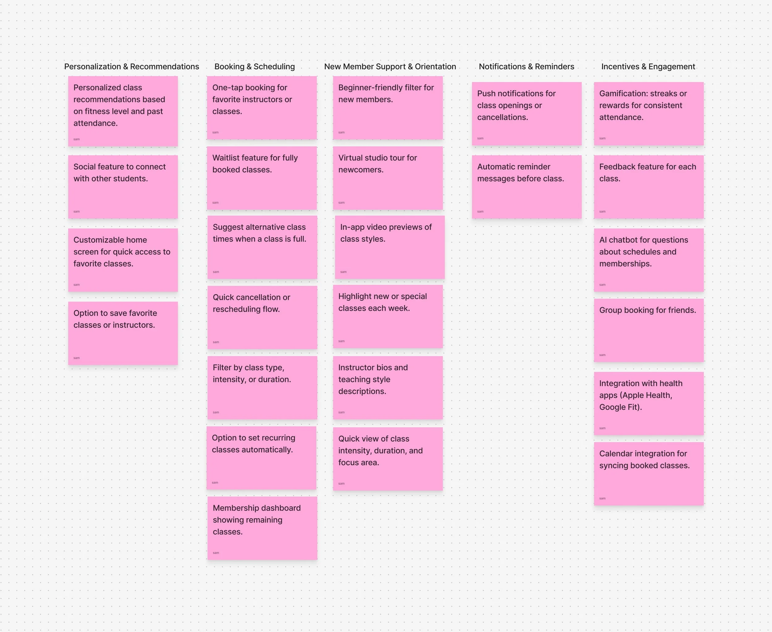 I started by reviewing my research and identified that a key challenge for Dragonfly users is easily finding, booking, and managing classes. During brainstorming in FigJam, I focused on generating a wide range of ideas without judging them, using techniques like adding and removing constraints to explore different possibilities. As ideas developed, I grouped them into themes like scheduling, personalization, and new member support, which helped me combine concepts into stronger solutions like the “Suggested for You” feed.