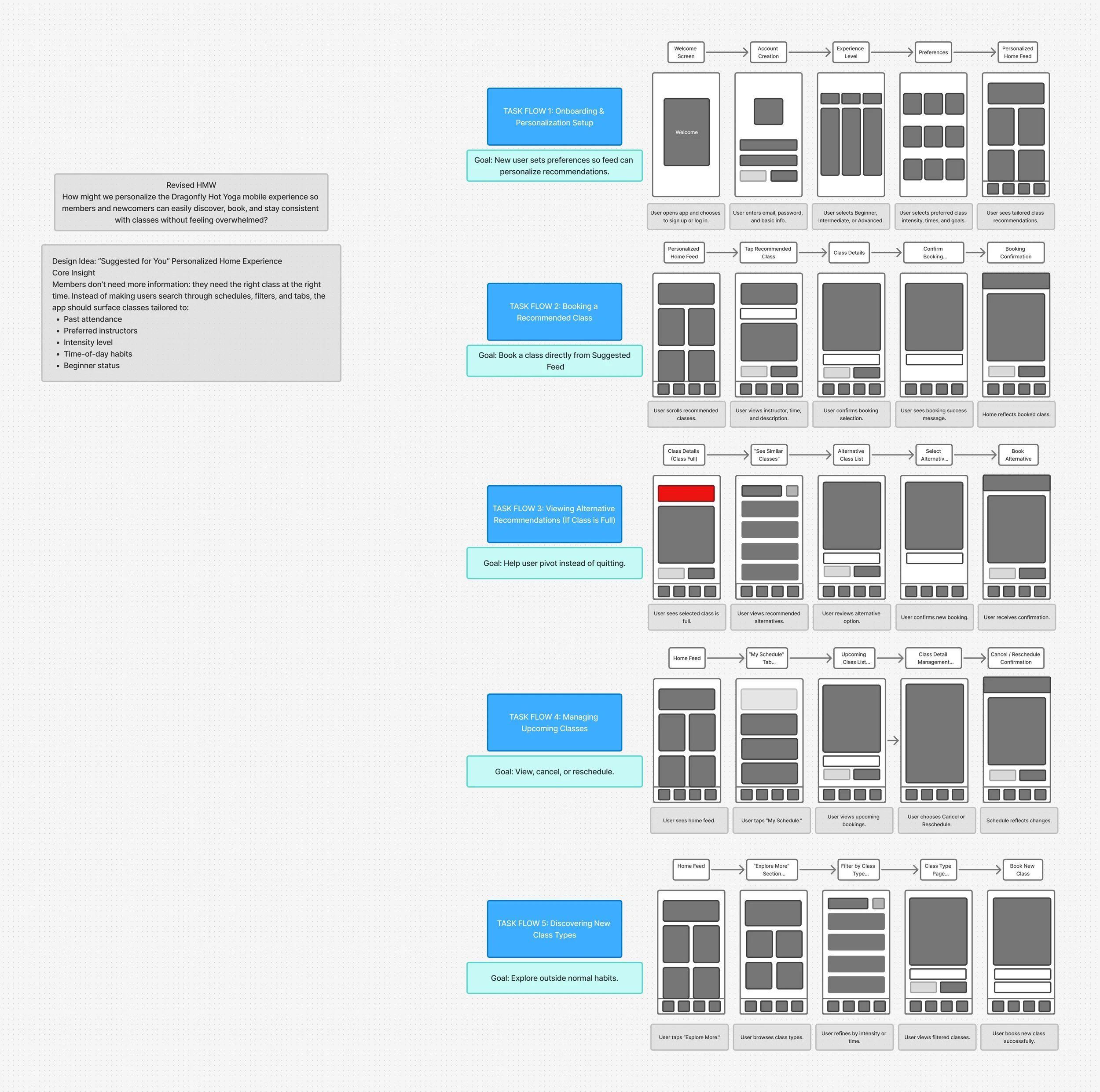 I focused on narrowing my concept down to one main feature: a “Suggested for You” personalized home feed for the Dragonfly Hot Yoga app. While I initially explored multiple ideas, I chose personalization because it directly addresses users feeling overwhelmed when trying to find and book classes.