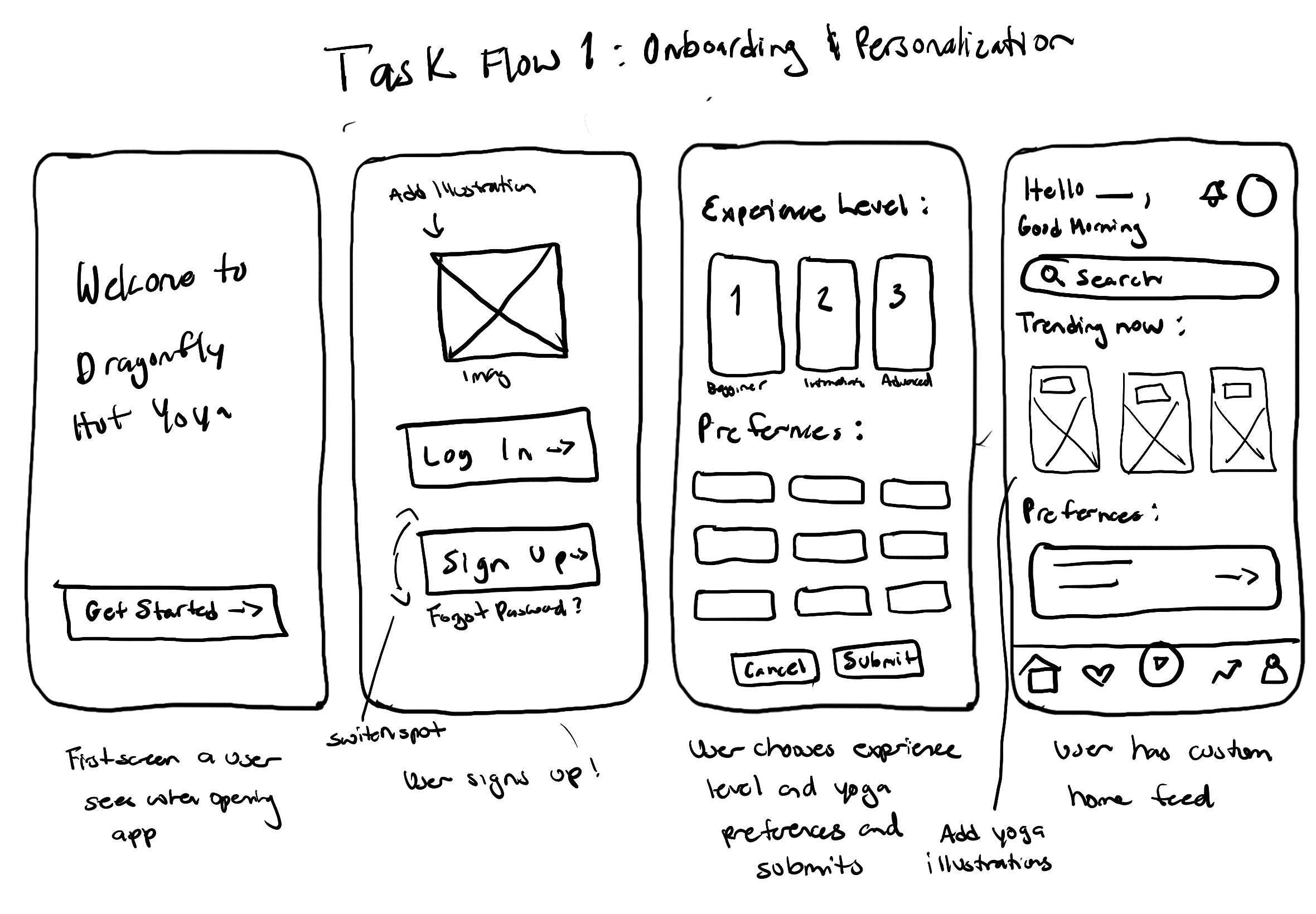 I created sketches for three key task flows in the Dragonfly Hot Yoga app: setting preferences, booking a class, and handling full classes. Before sketching, I revisited my problem to stay focused on making the experience simple, personalized, and stress-free.
