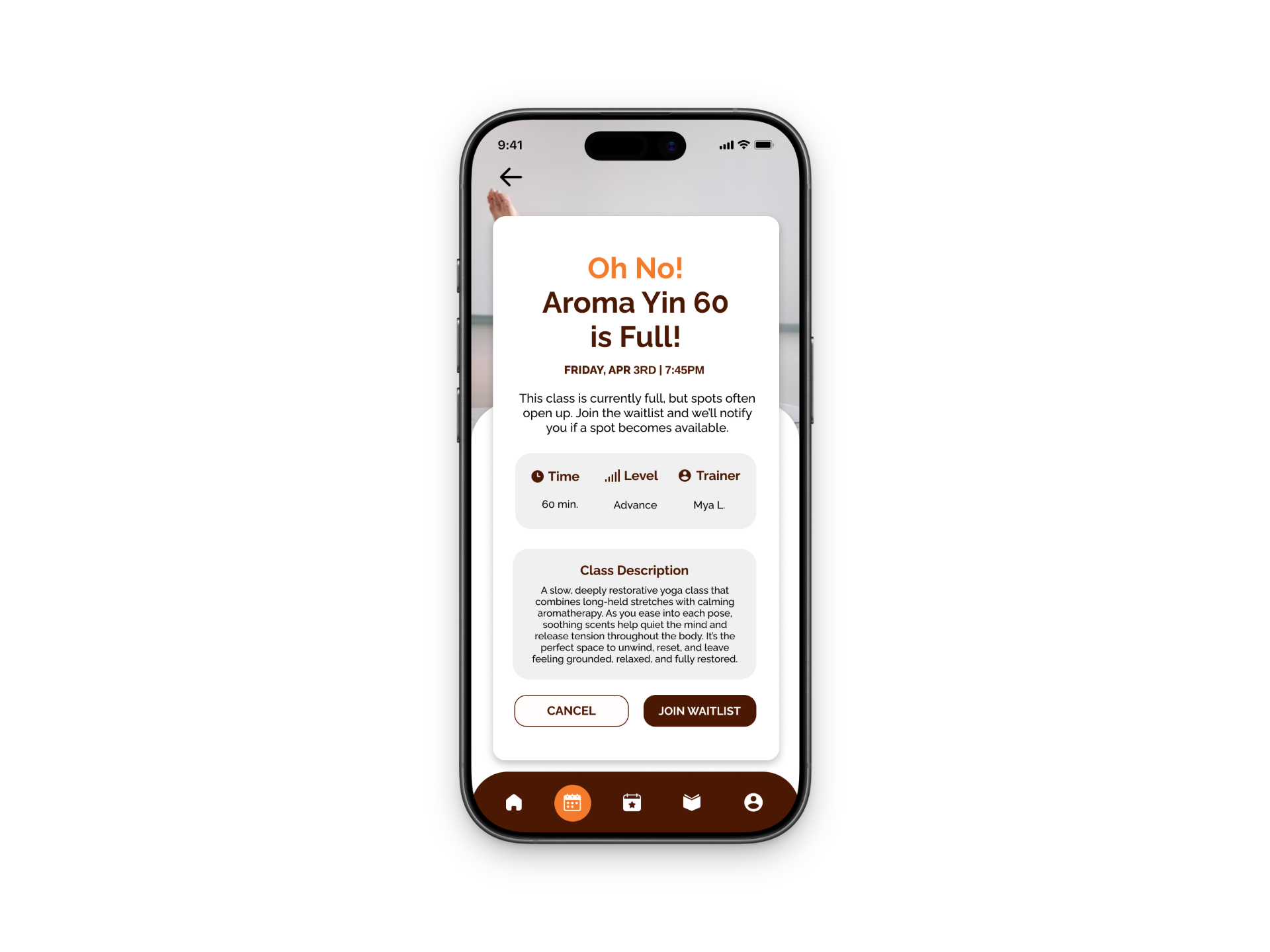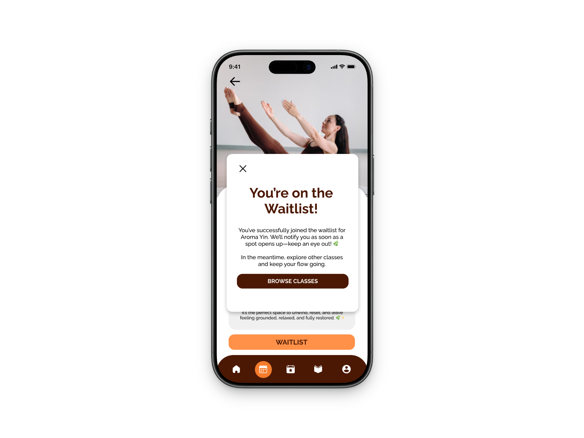 For booking, I made sure the process was really straightforward with clear class information and an obvious call-to-action. If a class is full, users can easily join a waitlist through a pop-up and are then encouraged to look at other available classes instead of just hitting a dead end. This keeps users engaged and still gives them options.